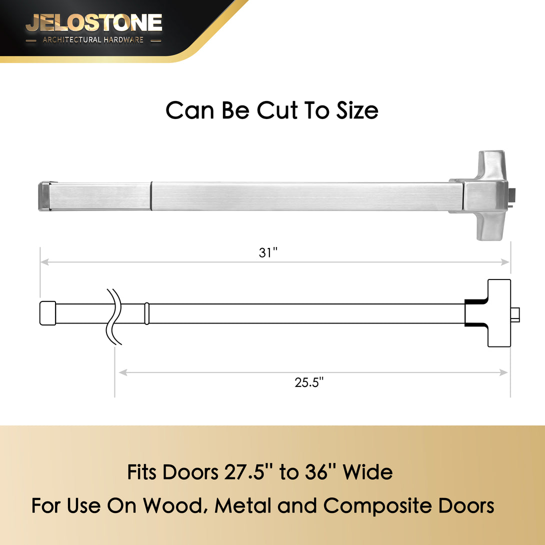 The JELOSTONE Commercial Door Push Bar Panic Exit Device, equipped with an exterior lever, has an overall length of 31'' and suits wood/metal doors 27.5''-36'' wide. It can be installed on both right-opening and left-opening doors, exhibiting great versatility. For narrow doors, the tail of the push bar can be trimmed to a minimum length of 25.5'', provided that the door width exceeds the panic bar length.