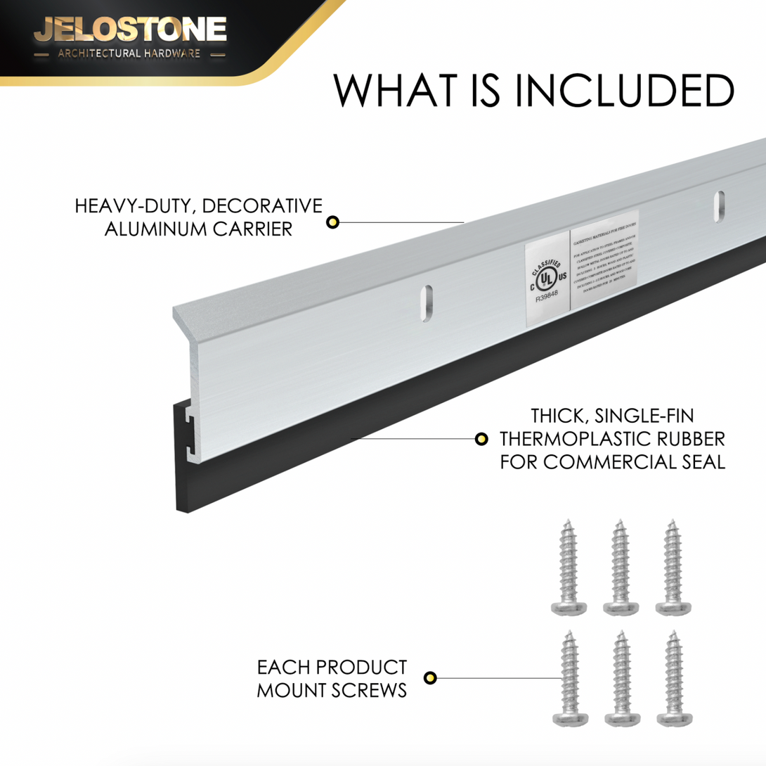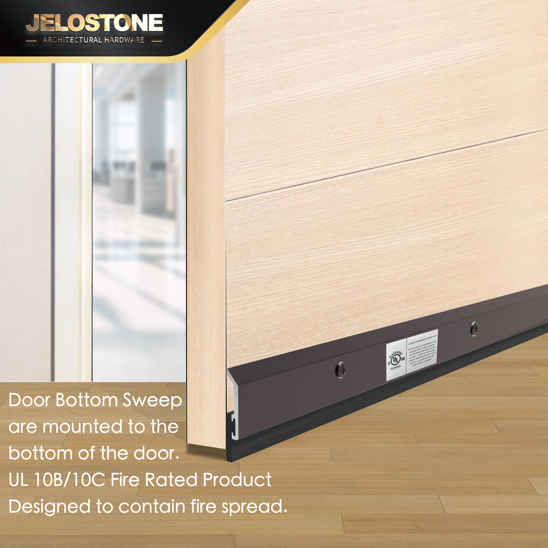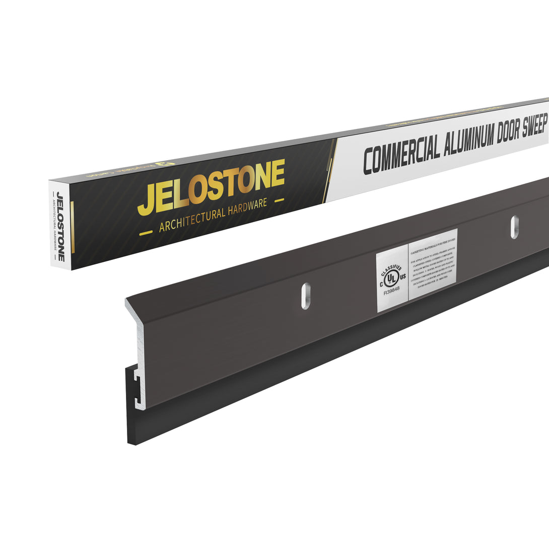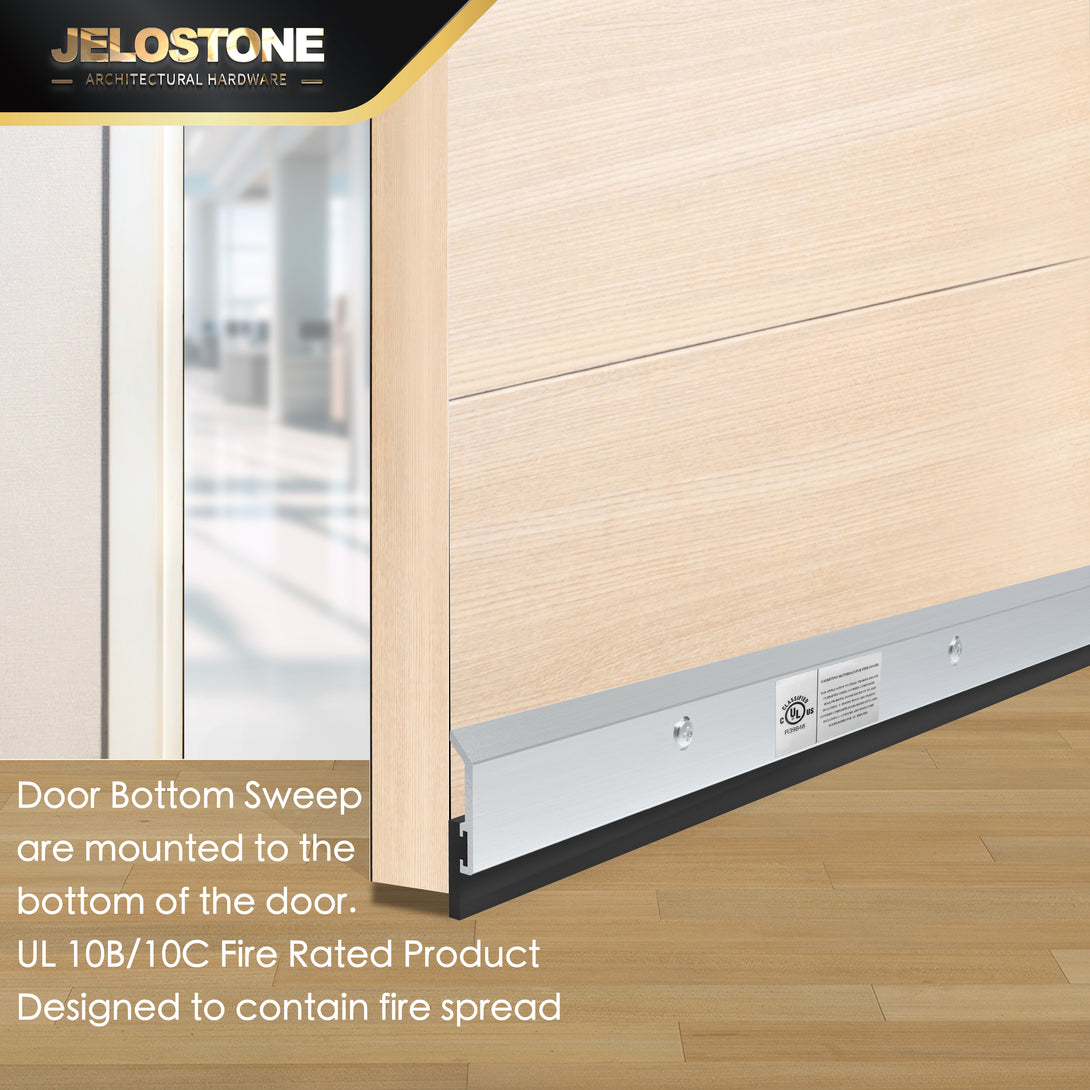 JELOSTONE Commercial Door Sweep is crafted from a heavy-duty anodized aluminum carrier and thick single-fin thermoplastic rubber. It has a UL 10B/10C fire-resistance rating, being both durable and providing additional safety protection.