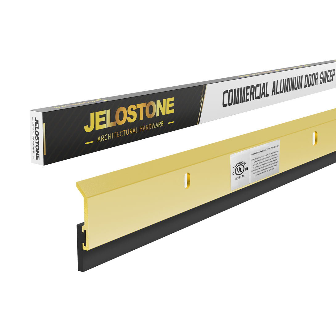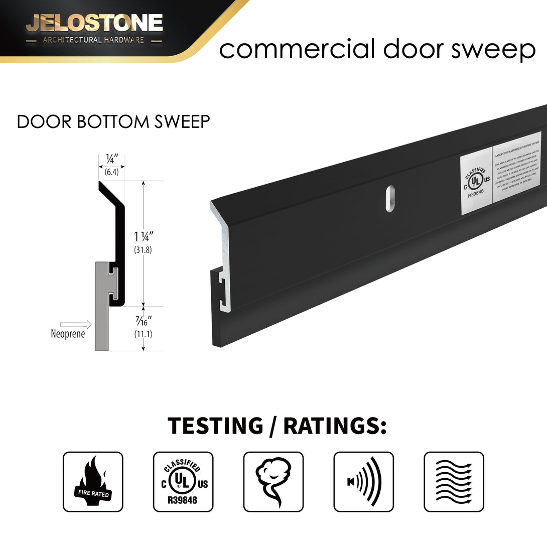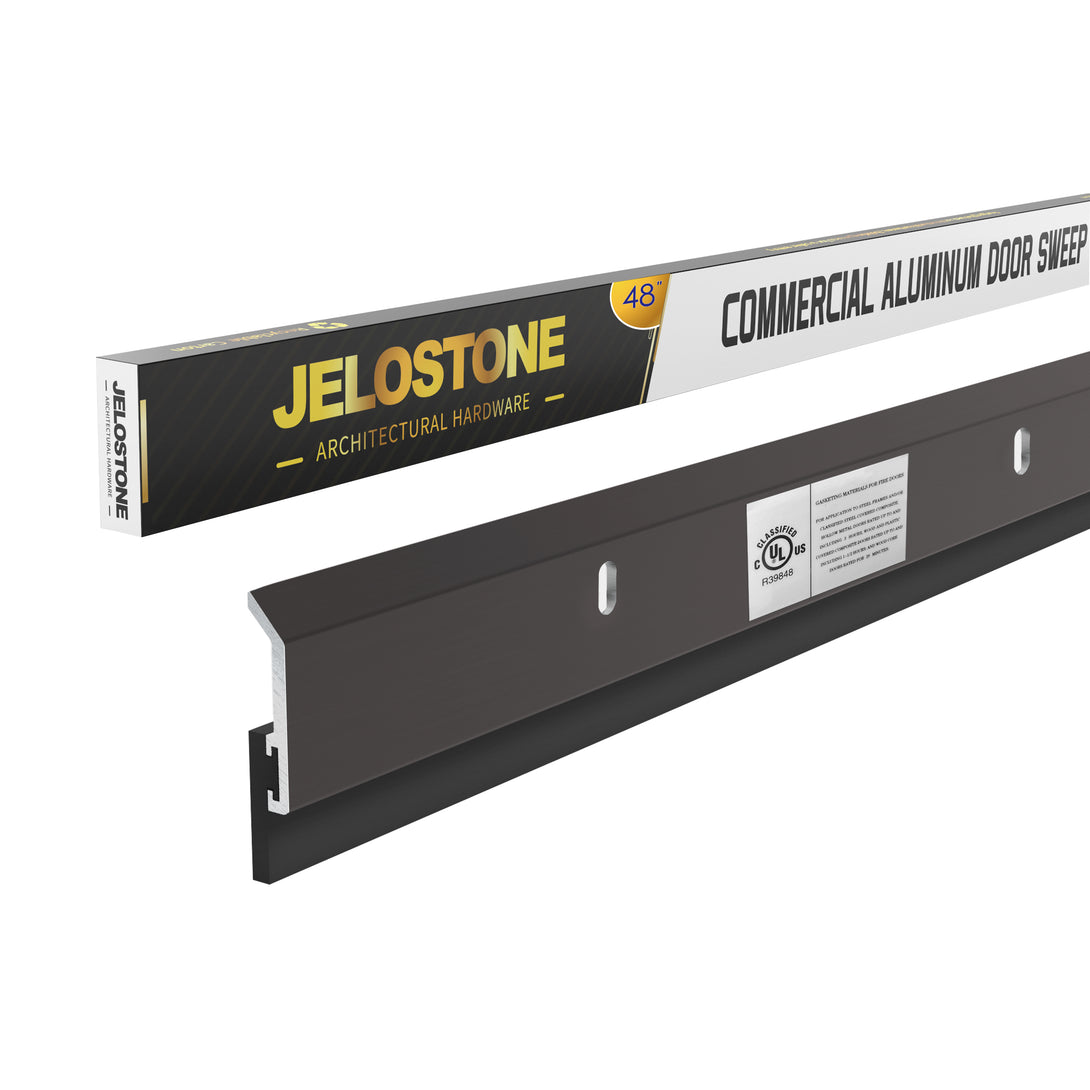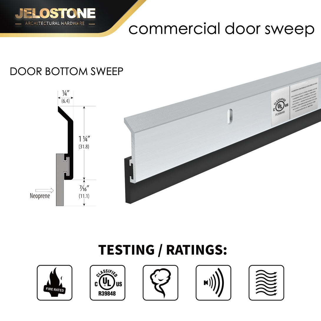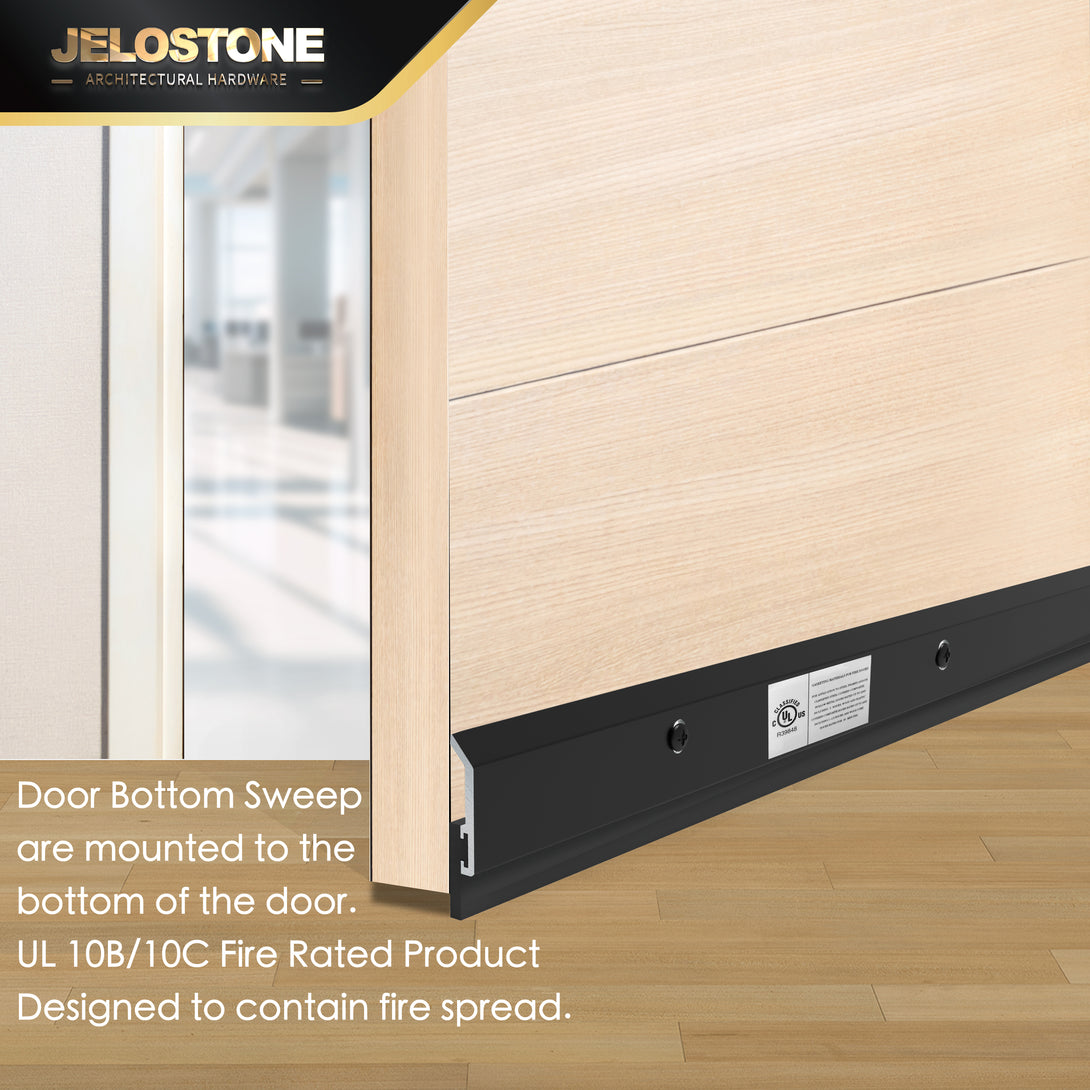 JELOSTONE Commercial Door Sweep is crafted from a heavy-duty anodized aluminum carrier and thick single-fin thermoplastic rubber. It has a UL 10B/10C fire-resistance rating, being both durable and providing additional safety protection.