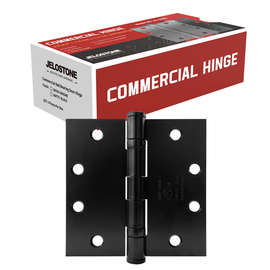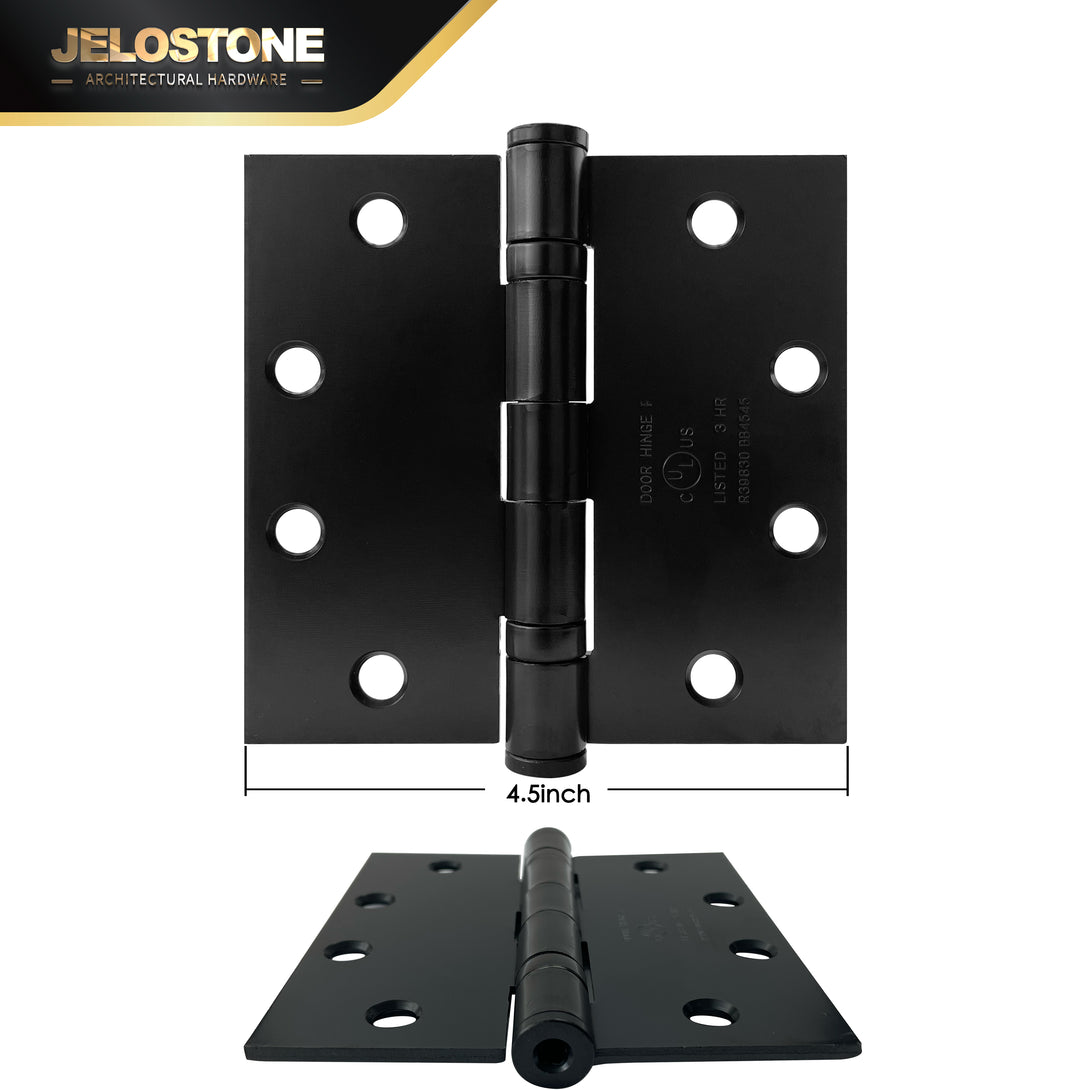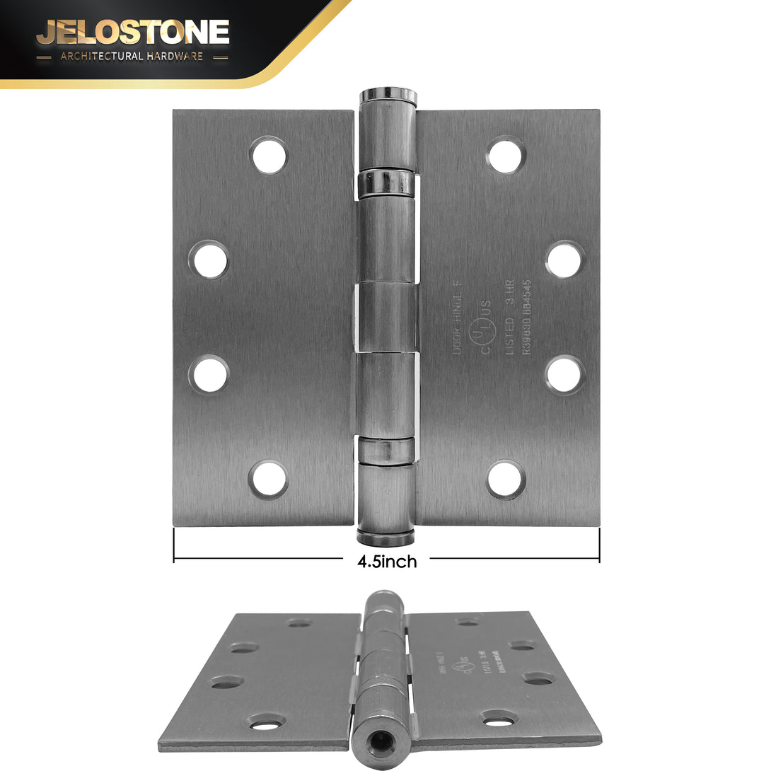 Each JS-5BB2 Ball Bearing hinge is 4.5" x 4.5" with square corners. These hinges are UL listed & 3 Hour Fire Rated, and meet ANSI/BHMA standards — meeting the safety standards for door hinges in the United States and Canada.