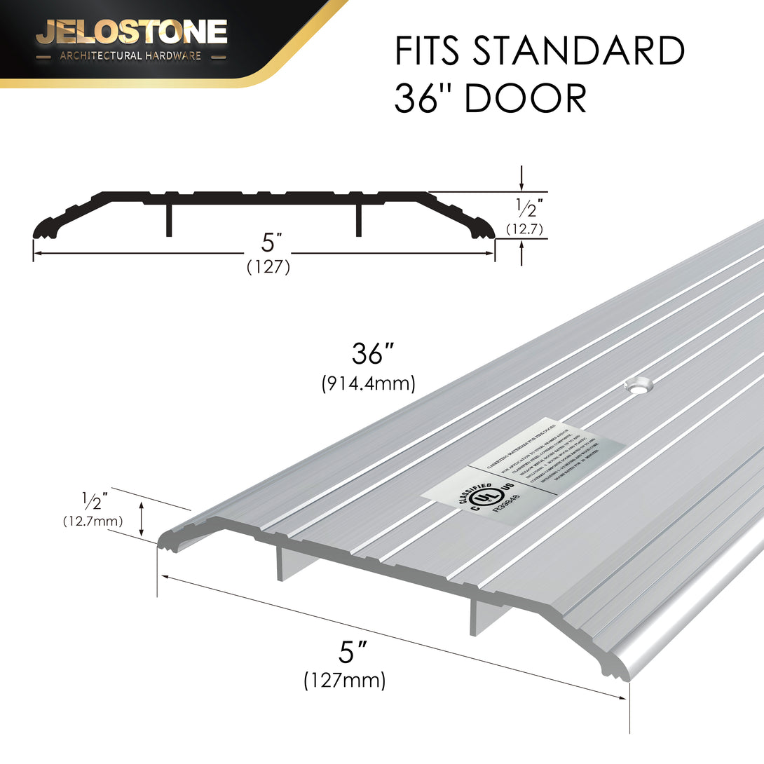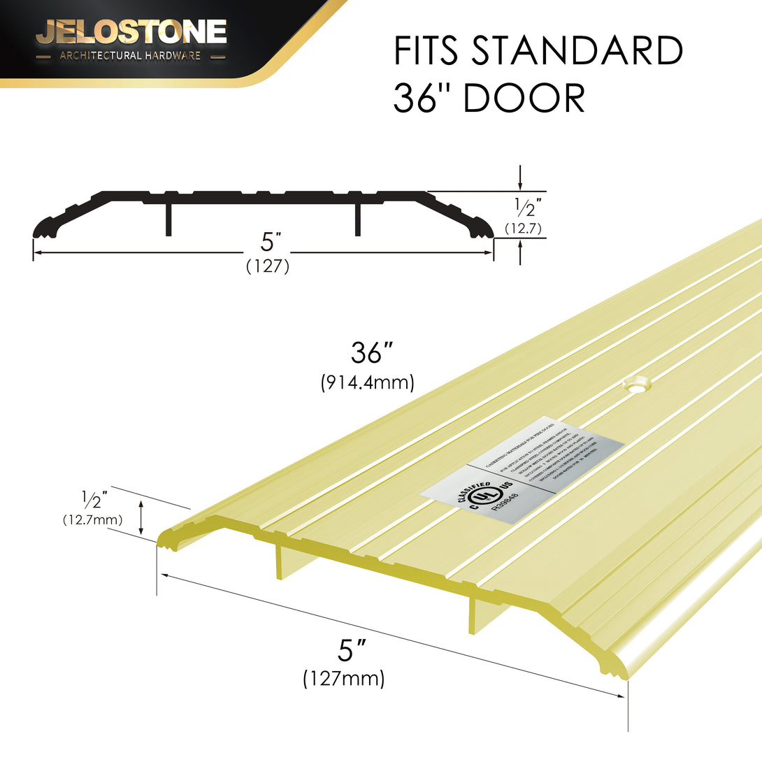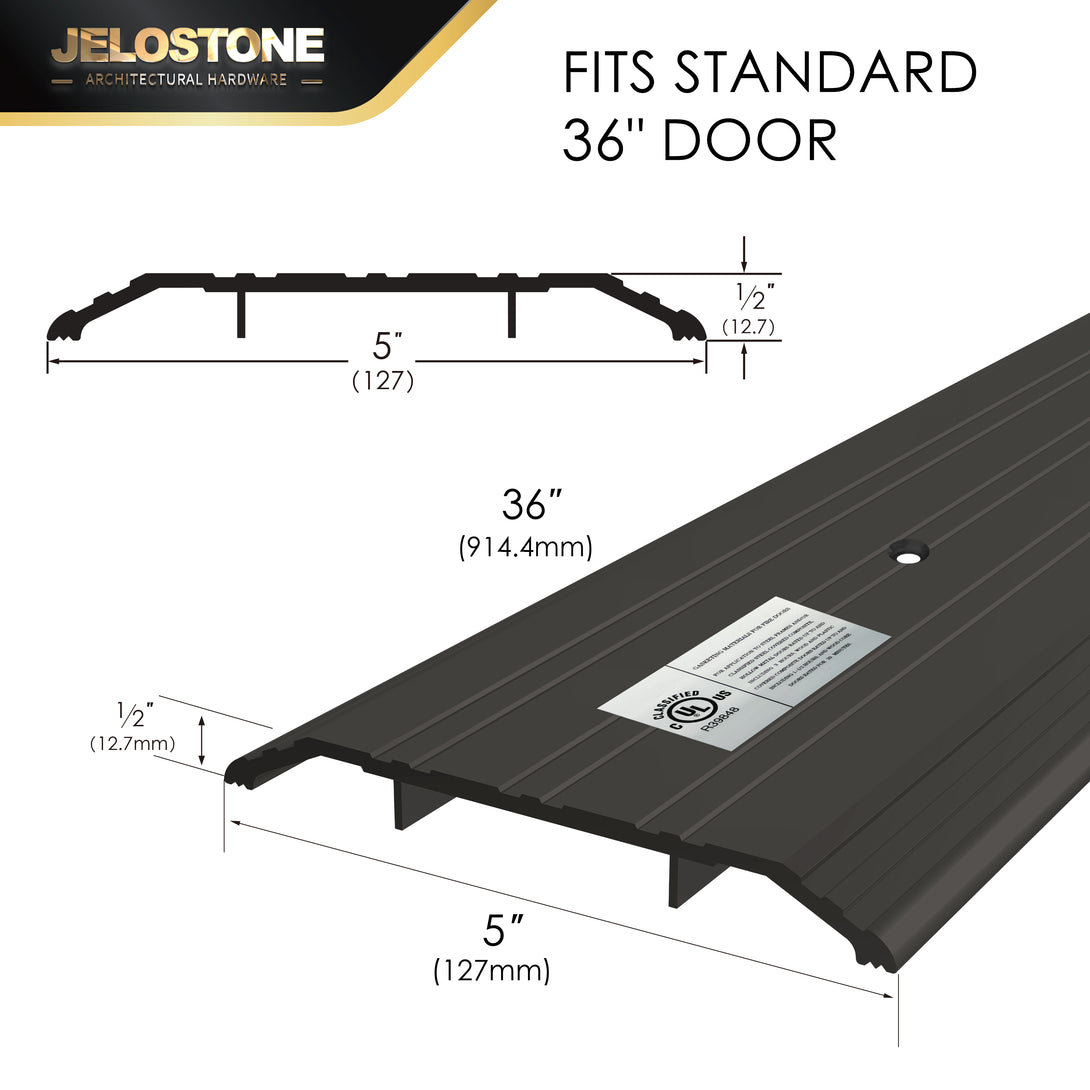 Measuring 5" wide and 1/2" high, available in 36" lengths, this threshold strip fits standard exterior doors, offering a tailored solution for various doorway dimensions.