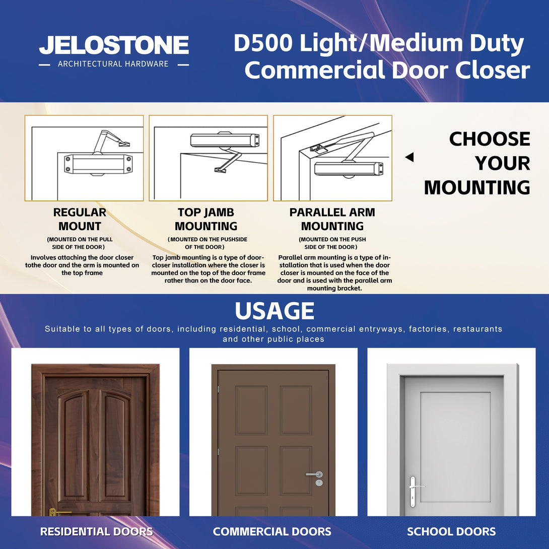 The top jamb mounting is a type of door closer installation where the closer is mounted on the top of the door frame, rather than on the door face.